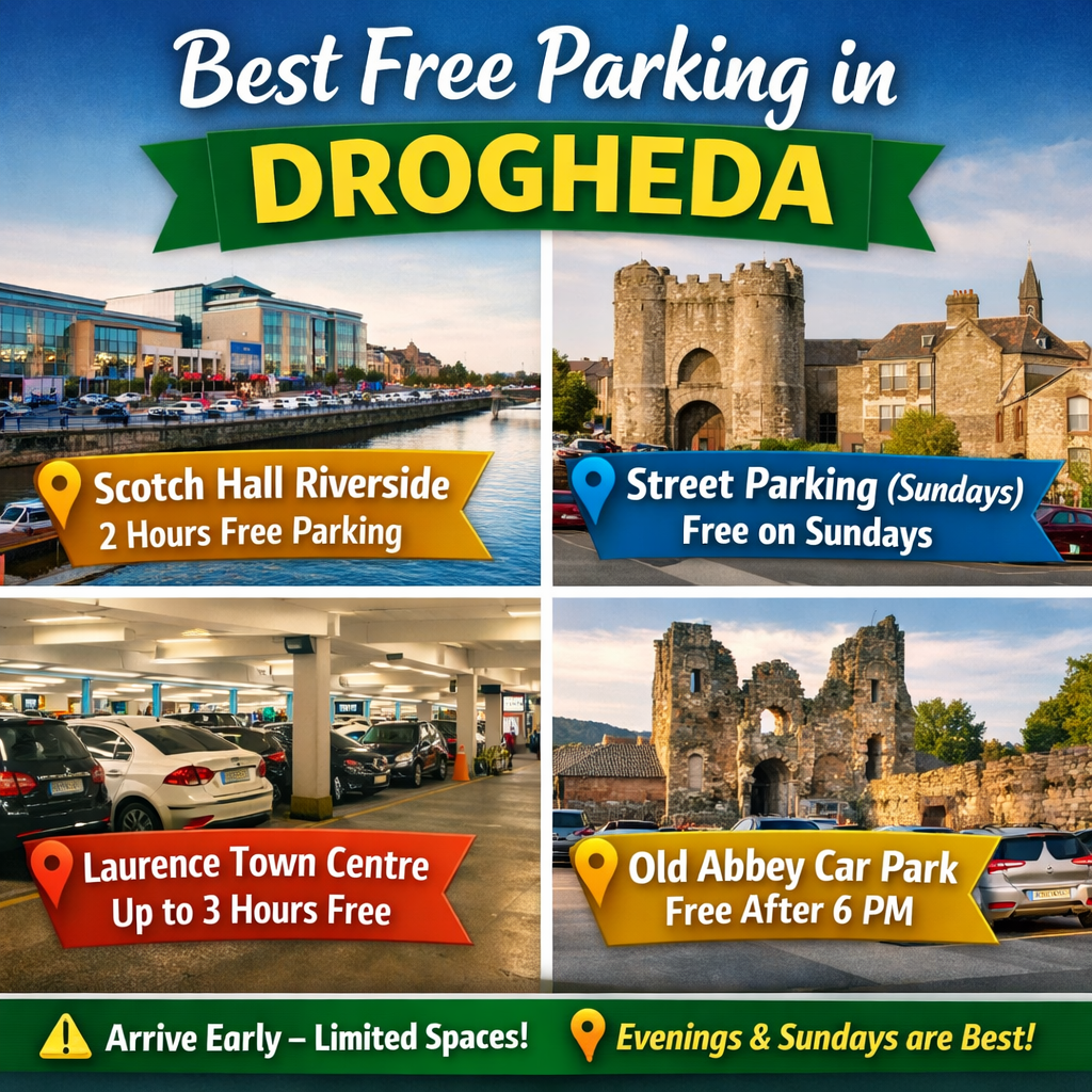 The good news: compared with bigger shopping destinations, Drogheda still has a reputation for being relatively parking-friendly, especially for short town visits. Even local community chatter describes Drogheda as a place with “free parking (in most places)” compared with busier retail hubs — but that only works if you know where to go and what not to assume.